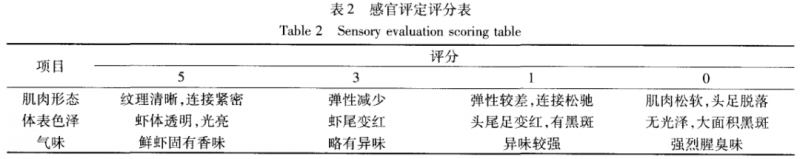 評定小組由 7 名經過一定訓練的人員組成(五女兩男),蝦的評定項目由體表色澤、氣味、肌肉形態組成,總分值在 9分(非常新鮮)和 0 分 (完全腐敗)之間,3分以下為不可接受,具體評分標準見表 2 。
