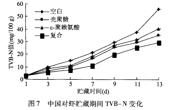 如圖 6所示,中國對蝦的感官品質在貯藏期間總體呈現下降趨勢,其中無處理的空白組下降的最明顯,在第 9d感官評分為 3,認定為完全腐敗。殼聚糖涂膜組在第 11 d徹底腐敗,經過殼聚糖涂膜處理的中國對蝦表面有一層保護膜,可以阻礙氧化反應的發生,抑制蛋白質變化,增加貯藏時間。e一聚賴氨酸處理組同樣在第 9d達到不可接受值,說明此 種處理方法在一定程度上抑制微生物的生長。與單獨涂膜處理相比,復合涂膜的效果更有利于延長貯藏時間,在第 13d感官評價值才低于不可接受值,與空白組相比延長 4 d。