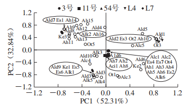 式中:Cri、Ti分別為各揮發性化合物的相對含量/%和氣味閾值/(μg/kg);Crstan、Tstan分別為對樣品風味貢獻最大組分的相對含量/%和氣味閾值/(μg/kg)。 ROAV≥1的物質為該品種金針菇的特征揮發性物質;0.1≤ROAV<1的物質對該品種金針菇整體風味有修飾作用,且ROAV越大說明該物質對該品種樣品總體風味貢獻越大。 不同品種金針菇揮發性物質的SPME-GC-MS分析 如表1所示,5個品種金針菇樣品中共檢測出53種揮發性成分,3號、11號、54號、L4和L7分別檢測出21、29、21、12種和18種成分,其中醇類、醛類和芳香烴類占總含量的60%~95%。不同品種金針菇僅有2種共有揮發性成分,分別為1-己醇和2-十一烷酮。每種金針菇都有3種或3種以上其他品種中不存在的化合物,3號、11號、54號、L4和L7中特有化合物數量分別為3、12、3、4種和4種。 如表2所示,辛醛、苯乙醛、壬醛、癸醛、2-十一烷酮、2-甲基丁酸甲酯、D-檸檬烯為3號金針菇的特征揮發性物質(ROAV≥1),香葉基丙酮對3號金針菇的整體風味起修飾作用(0.1≤ROAV<1);1-己醇、反式-2-庚烯醛、辛醛、反式-2-辛烯醛、壬醛、2-十一烷酮、香葉基丙酮、2-正戊基呋喃、D-檸檬烯為11號金針菇的特征揮發性物質(ROAV≥1),1-庚醇、1-辛醇對11號金針菇的整體風味起修飾作用(0.1≤ROAV<1);1-壬醇、辛醛、壬醛、癸醛、2-十一烷酮、D-檸檬烯為54號金針菇的特征揮發性物質(ROAV≥1),1-辛醇、反式-2-庚烯醛對54號金針菇的整體風味起修飾作用(0.1≤ROAV<1);1-壬醇、庚醛、辛醛、反式-2-辛烯醛、癸醛、2-十一烷酮、2-正戊基呋喃為L4金針菇的特征揮發性物質(ROAV≥1),1-己醇對L4金針菇的整體風味起修飾作用(0.1≤ROAV<1);反式-2-辛烯醛、反,反-2,4-癸二烯醛、癸醛、2-十一烷酮為L7金針菇的特征揮發性物質(ROAV≥1),1-己醇、1-辛醇、反式-2-庚烯醛對L7金針菇的整體風味起修飾作用(0.1≤ROAV<1)。 5種金針菇中共檢測出5種醇類化合物,存在于4個品種金針菇中的1種,是1-辛醇,1-庚醇和1-戊醇均只在11號金針菇中被檢測到。 5種金針菇中共檢測出10種醛類化合物,在4種金針菇中被檢測到的有3種,分別為己醛、辛醛和癸醛,庚醛、苯乙醛和反,反-2,4-癸二烯醛分別是L4、3號和L7金針菇中特有化合物。酸類化合物只在54號金針菇中被檢測到,5種金針菇中共檢測出7種酯類化合物。其中只有鄰苯二甲酸二異丁酯存在于2種金針菇中,其他6種化合物均屬于特有化合物。5種金針菇中共檢測出3種酮類化合物,共有的1種,為2-十一烷酮。 5種金針菇中共檢測出6種烷烴類化合物,特有化合物2種,分別為壬烷和2,6,10,14-四甲基十六烷。 5種金針菇中共檢測出5種其他類化合物,獨有化合物有2種,分別為2-甲基-2-(1-甲基乙基)環氧乙烷和4,5,6,7-四氫-3,6-二甲基-苯并呋喃。 表2 不同品種金針菇樣品中揮發性成分及對應的ROAV 為了顯示5個品種金針菇樣品組中53種揮發性成分的差異,使用PCA對SPME-GC-MS進行分析。如圖1所示,前2個主要成分的貢獻率是85.15%;PC1占52.31%,PC2占32.84%。PC1和PC2都明確區分了不同品種,5個樣本組相互之間很好地分開,說明不同品種金針菇間揮發性風味相互獨立,且這2個主成分可代表樣品風味的主要特征。所有的揮發組分根據不同品種樣品組也同樣明顯地區分開,其中,54號金針菇樣品組與12種化合物分布重疊,11號金針菇樣品組與4種化合物分布重疊。而其他3個品種樣品組雖然沒有與化合物重疊,但四周都有各自相關的化合物。然而還是有很多比較分散的化合物,處于不同品種之間。這表明盡管使用53種揮發性化合物也可以將品種區分開,但是金針菇的揮發性風味物質較復雜,并且在不同品種中有許多相似的物質,因此僅用SPME-GC-MS判別不同品種金針菇風味較為局限。 圖1 不同品種金針菇樣品基于SPME-GC-MS的PCA 為了進一步分析SPME-GC-MS對于不同品種金針菇揮發性風味成分區分情況,將SPME-GC-MS數據進行HCA,結果如圖2所示。從圖2可以看出,不同品種金針菇揮發性成分的聚類樹狀圖顯示出3個主要類別。其中,11號、54號和L7的樣品被歸為一類,而L4和3號的樣本被分別歸為其余兩類。在第一大類中,11號和54號的樣品在最小距離水平上首先聚類,這說明二者的樣品揮發性成分相似度很高。隨著歐式距離的增加,L7的樣品也并入到這一類中。而當歐式距離增加至13時,L4與11號,54號和L7的樣品歸為一類。隨著歐式距離的繼續增大,當增至25時,三大類才歸為一類。這與2.1.2節結果一致。HCA差異主要由不同品種中各類化合物種類和含量不同造成。結合表1可知,由于醇類、醛類和芳香烴類物質占所檢測總物質的60%~95%,因此影響樣品聚類的主要因素是三者的相對含量。 將電子鼻數據作雷達圖,如圖3所示,顯示12個傳感器對5個不同品種金針菇樣本組的響應。傳感器PA/2、T70/2、P40/1、P10/2、P10/1和T30/1對L7金針菇的揮發性氣味響應值最高;傳感器LY2/G、LY2/AA、LY2/GH、LY2/gCTL和LY2/gCT對3號金針菇的揮發性氣味響應值較高;傳感器LY2/LG對5種金針菇樣品的揮發性氣味響應值相似。3號和L4響應值的輪廓相似,表明兩者的香氣成分接近,但是PA/2、T70/2、T30/1對3號和L4品種的金針菇樣品響應值可以明顯區分這2種金針菇。其余3種金針菇樣品響應值的輪廓相似,說明這幾個品種的金針菇樣品的香氣成分接近,但是LY2/G、LY2/AA、LY2/GH、LY2/gCTL對11號、54號、L7品種的金針菇樣品響應值可以明顯區分這3種金針菇。 圖3 不同品種金針菇樣品中揮發性化合物的雷達指紋圖 
