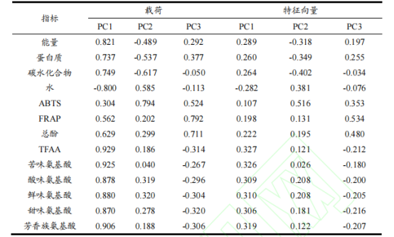 對芫根各品質指標利用SPSS進行主成分分析,結果如表3所示,前三個主成分的特征值都大于1,且方差貢獻率累計達到97.119%,因此選用前3個主成分用于綜合評分。3個主成分的載荷矩陣如表4所示,PC1的方差貢獻率為62.034%,反應了大部分指標的信息,其中總游離氨基酸含量與PC1呈高度正相關,水分含量與PC1呈負相關;ABTS抗氧化能力與PC2呈高度正相關,FRAP抗氧化能力與PC3呈高度正相關。