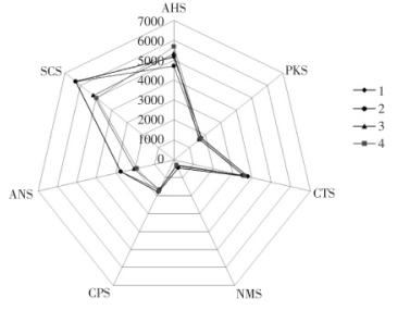 由圖4可知,電子舌的7個傳感器對不同菌菇類魚松樣品均能做出不同程度的響應(yīng)。其中傳感器SCS和AHS的響應(yīng)信號最強(qiáng),傳感器NMS的響應(yīng)信號最弱。各菌菇魚松的傳感器SCS、ANS和AHS的響應(yīng)信號有明顯的差異,而傳感器CPS、NMS、CTS和PKS的響應(yīng)值差異不明顯。