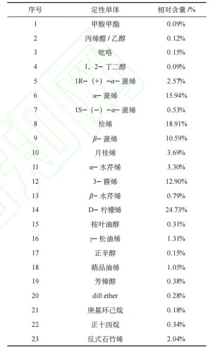 使用移液槍移取30μL胡椒精油于20mL頂空進(jìn)樣瓶中,利用電子鼻開發(fā)的胡椒精油檢測方法對樣品檢測,使用超快速氣相電子鼻自帶Arochembase數(shù)據(jù)庫對胡椒精油中揮發(fā)性成分進(jìn)行定性和相對定量分析。