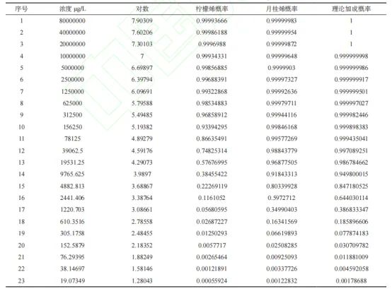 P=0.5時(shí)的檸檬烯+月桂烯混合物的濃度為檢測閾值。其檢測閾值為8544.17μg/L。