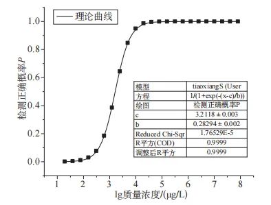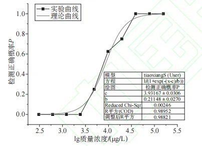 繪制以香氣化合物的質(zhì)量濃度對數(shù)為橫坐標(biāo),以正確識別概率的校正值P為縱坐標(biāo)的曲線。將上述10個(gè)數(shù)據(jù)點(diǎn),應(yīng)用S型曲線P=1/(1+e(-(X-C)/D))進(jìn)行擬合。