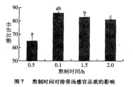 由圖7可知 ,隨著湯汁熬制時(shí)間的增加,排骨湯的感官評(píng)分呈先升高后降低的趨勢(shì)。當(dāng)熬制時(shí)間為1.0h時(shí),排骨湯的感官評(píng)分最高,與熬制0.5h和 1.5h的樣品沒有顯著差異 (P>0.05),但與熬制2.0h的樣品存在顯著差異 (P<0.05)。