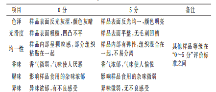 參加感官評價的20位食品專業的學生都具備一定感官評定基礎,且預先進行過感官實驗的培訓。每種樣品從看、聞、嘗3個方面進行評價,分別就色澤、光滑度、均一性、香味、腥味、異味、嫩度、油膩度、整體口感9個指標打分,每種指標總分5分,具體標準見表1。感官評價時隨機抽取10名學生組成感官評定小組,從樣品的色澤、組織狀態、氣味、滋味4個方面進行感官評價。每次感官品鑒之前需用飲用水漱口,評價時不能互相討論。