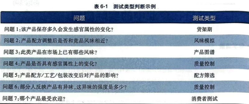 當(dāng)企業(yè)在新產(chǎn)品開發(fā)環(huán)節(jié)中運(yùn)用到感官評(píng)價(jià)時(shí),研發(fā)人員以及營(yíng)銷人員會(huì)針對(duì)感官分析師提出很多問題。在企業(yè)運(yùn)用中,我們根據(jù)目的可以將感官評(píng)價(jià)分為以下幾類:貨架期、配方篩選、產(chǎn)品圖譜、質(zhì)量控制、風(fēng)味模擬、消費(fèi)者測(cè)試,見表6-1。