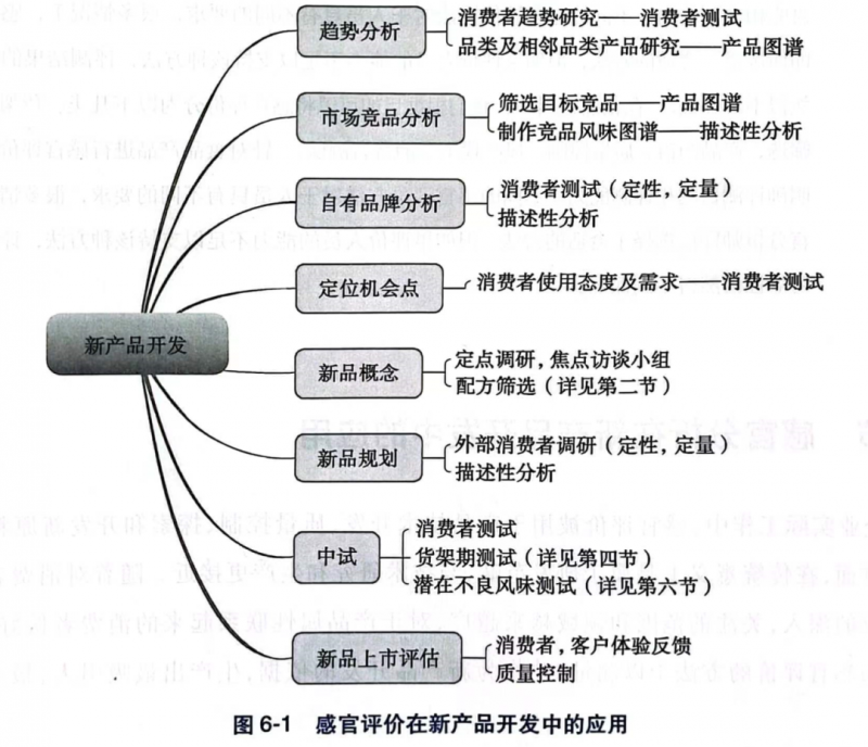 完整的新品開發(fā)流程具有很多環(huán)節(jié),其中包含產(chǎn)品趨勢(shì)分析,自有品牌分析,新品概念的生成,產(chǎn)品線規(guī)劃,中試以及新品上市放行等。因此,在新品開發(fā)中感官評(píng)價(jià)的方法是綜合性的,即多個(gè)感官測(cè)試貫穿于整個(gè)新品開發(fā)流程中。常見方法分布見圖6-1。