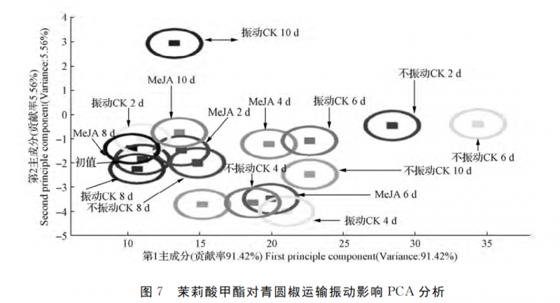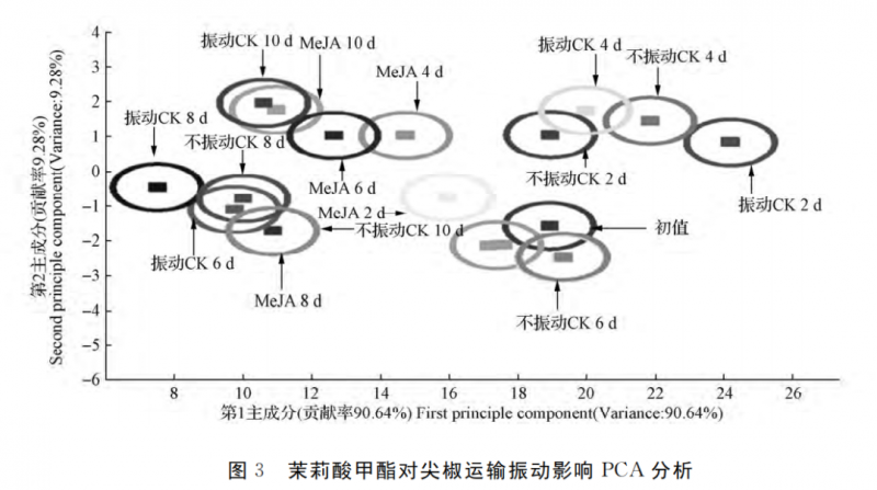 如圖7所示,為運(yùn)輸振動(dòng)清水 CK 和不振動(dòng)清水 CK 青圓椒的 PCA 分析圖(B組),其中尖椒主成分1的貢獻(xiàn)率為91.42%,主成分2的貢獻(xiàn)率為5.56%,總貢獻(xiàn)率為96.98%。表明2個(gè)主成分已經(jīng)基本代表了樣品的主要信息特征,電子鼻能夠?qū)悠泛唾A藏時(shí)間加以區(qū)分。從圖7可以看出,青圓椒振動(dòng)清水 CK 組、不振動(dòng)清水 CK 組和振動(dòng) MeJA 組在相同貯藏天數(shù)下,揮發(fā)性物質(zhì)成分區(qū)域并未重合,可以很明顯的看出,振動(dòng) MeJA 組的揮發(fā)性物質(zhì)成分區(qū)域比振動(dòng)清水 CK 組和不振動(dòng)清水 CK 組更接近初值。試驗(yàn)表明,用MeJA 處理可以有效抑制青圓椒氣味的改變,延長青圓椒的貨架期,保持其新鮮度。