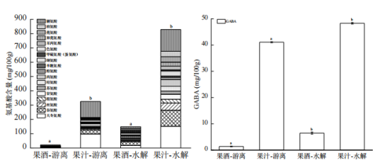 03 百香果果汁和果酒中的氨基酸分析果汁酒和原果汁中均檢測到18種游離氨基酸,與百香果果汁相比,百香果果酒的甜味氨基酸(Thr、Gly、Ala、Pro、Ser)的占比增加了5.90%,苦味氨基酸(His、Met、Arg、Val、Leu、Ile、Tyr、Phe)含量也顯著下降。經(jīng)完全水解后,兩個(gè)樣品中的氨基酸含量都有所增加。