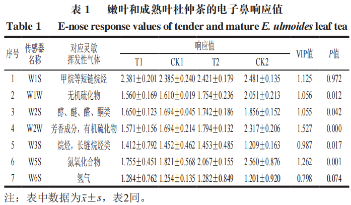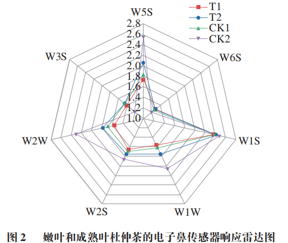 杜仲葉富含木脂素、環烯醚萜、酚類、類固醇、萜類、類黃酮等活性物質,具有滋補肝腎、調節血壓的保健功能。電子鼻是一種模仿人類嗅覺感知-解釋-辨別過程的氣體傳感器陣列,可以對特定的揮發物做出特殊響應。電子鼻和HS-SPME-GC-MS技術聯用常用于區分和鑒別不同產地、不同工藝下的茶類、果類和酒類的香氣特征差異。