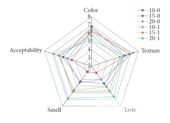 樣品感官評分最高的是20-1組,得分為31.5。感官評分表明,15-1組和20-1組的顏色得分均低于對照組,這可能是由于樣品隨著烤制時間的增加而變暗。結果表明,孜然的加入可以改善鮮味,增加孜然的特征香氣,掩蓋異味,改善酯香氣。
