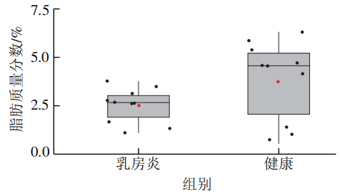 如表1和圖1所示,脂肪質量分數、密度、蛋白質量分數、冰點4 個指標P值均小于0.05,具有顯著差異,與健康組相比,乳房炎組牛乳脂肪質量分數顯著降低(P<0.05)。脂肪在體細胞數量較多的牛乳中顯著下降,可能是由于乳房發炎期間乳腺細胞合成和分泌能力下降。乳房炎牛乳中蛋白質含量增加,可能是由于奶?;既榉垦缀髸黾尤榉棵氀艿耐ㄍ感?,從而使蛋白含量增加。其余指標在兩種牛乳間差異不顯著(P>0.05)。