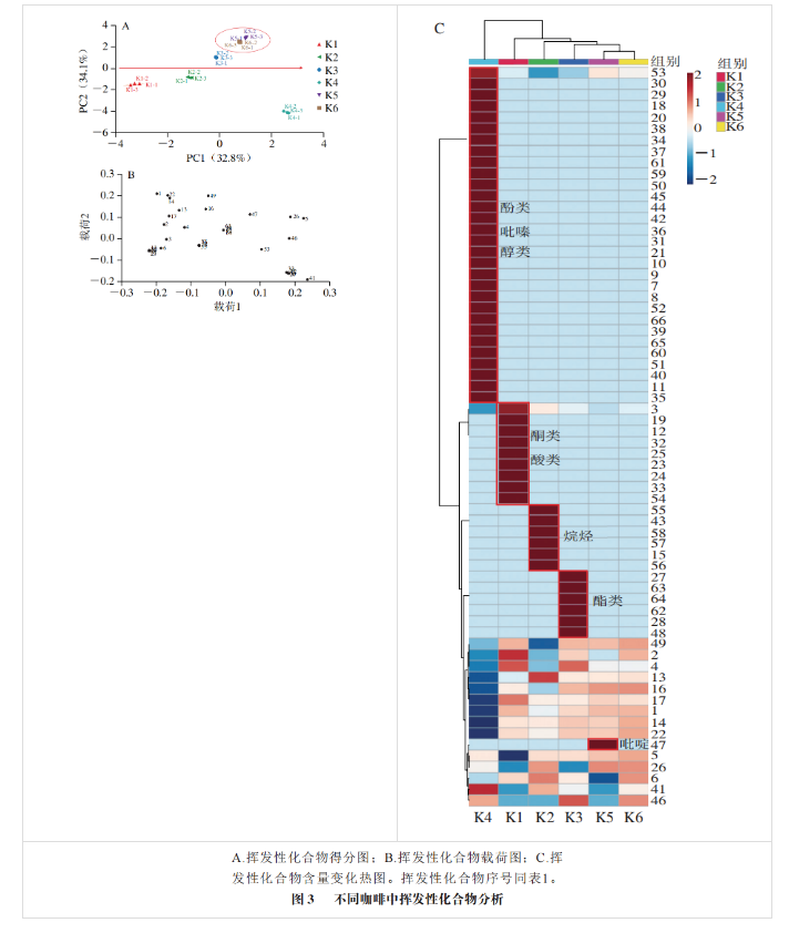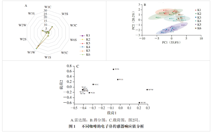 02 不同咖啡的滋味輪廓分析利用電子舌快速分析滋味輪廓,如圖2A所示。6種樣品的雷達圖輪廓類似,只有酸味傳感器的響應值為負,說明酸味對咖啡整體滋味的貢獻較小。各樣品在鮮味與咸味傳感器上的響應值差異最大,表明這兩種傳感器對滋味特征的區分效果最好。為根據滋味特征進一步區分6種咖啡,對電子舌傳感器響應值結果進行PCA(圖2B)。6種咖啡輪廓未重疊,滋味特征明顯,易被區分。K3、K5和K6咖啡在PC1的正方向,主要受鮮味、咸味、厚味影響;K1、K2和K4咖啡在PC1的負方向,主要由澀味、酸味、苦味影響(圖2C)。每個樣品聚類的距離與滋味特征接近度相關,有相同咖啡配比的K1~K4樣品,烘焙程度不同,距離較遠,說明電子舌可以區分不同烘焙度的咖啡。K5、K6咖啡分別與K1、K3咖啡輪廓接近,說明不同的咖啡配比在一定程度上能夠彌補烘焙程度的差異,使不同烘焙度的咖啡具有類似的滋味輪廓。