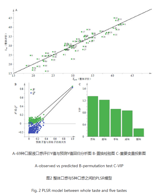 口服液整體口感預(yù)測模型:置換檢驗(yàn)的R2回歸線的Y軸截距為−0.0176,Q2回歸線的Y軸截距為−0.3290,表明建立的模型沒有出現(xiàn)過度擬合,預(yù)測能力良好;圖2-C為口嘗結(jié)果PLSR模型獲取其變量重要性投影圖,通過該模型獲取其變量重要性投影(variableimportancefortheproject,VIP)值,VIP值是反映自變量對因變量的解釋能力的重要指標(biāo),VIP值越大說明自變量對因變量解釋能力越強(qiáng),其中苦味和甜味VIP值>1,說明苦味和甜味是影響口服液整體口感的重要變量。