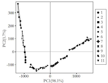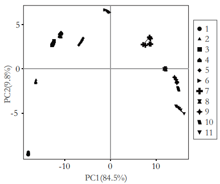 由圖3可知,第一和第二主成分貢獻率之和達到99.8%,即這2種主成分涵蓋了11組樣本絕大部分的原始數據信息,其中PC1的貢獻率為98.1%,PC2的貢獻率為1.7%,且樣本間的差異主要表現在第一主成分上。各樣本之間均無重合,表明電子舌技術能夠明顯地將不同比例苦蕎米飯區分。在PCA圖中隨著苦蕎米添加量的增加,樣本逐漸從X軸的左軸向右軸移動,各樣本在滋味上呈現一致規律,表明隨著苦蕎米比例增加滋味逐漸變化。由于PC1的貢獻率大,所以樣本在橫坐標上的距離越大,表明了樣本之間的差異越大。結合圖2可知,苦蕎米添加量越高,酸味、咸味、鮮味、基本味的響應值越大,與PCA圖的變化趨勢相對應,其中4號樣與3號樣品距離較遠,4號樣品開始出現滋味加重的現象,與3號樣品差異明顯。