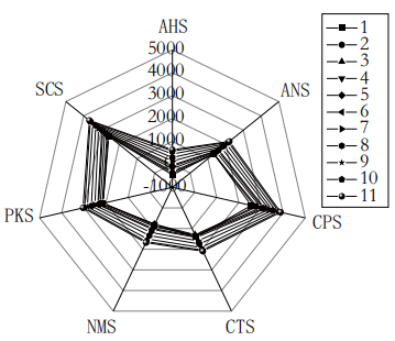 對所有樣品電子舌傳感器的響應值繪制雷達圖(圖2),其中SCS傳感器、CPS傳感器的響應值最高,其次是ANS傳感器、CTS傳感器、PKS傳感器的響應值較高。通過味覺分析比較發現不同比例苦蕎米飯的滋味呈現一定的規律性,隨著苦蕎米添加量的增大,各傳感器的響應值也隨之增大。上述結果表明,不同比例的苦蕎米飯滋味會因苦蕎米添加量的不同而逐漸變化。