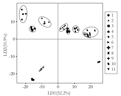 由于圖4中樣本間相互重疊,組內樣品分布離散,分類效果并不理想,PCA不能區分樣本間的差異,故進行線性判別分析(LDA)。LDA結果如圖5所示。由圖5可知,LD1的貢獻率為52.2%,LD2的貢獻率為31.9%,其累計貢獻率為84.1%,能夠反映樣品中的大部分氣味信息。1、2、11號樣本與其余樣本距離較遠,表明了1、2、11號樣本與其余樣本之間的差異較大。6~10號樣本距離較近,存在部分重疊現象,說明這幾組樣本氣味相似,并且隨著苦蕎米添加量的增大,樣本呈現出從左向右依次移動的趨勢。1、2號樣本米飯的香味較重、苦蕎的香味較淡,苦蕎香味從3號樣本開始逐漸明顯,11號樣本苦蕎味過重。綜上所述,電子鼻結合線性判別分析可較好地區分不同比例苦蕎米飯。