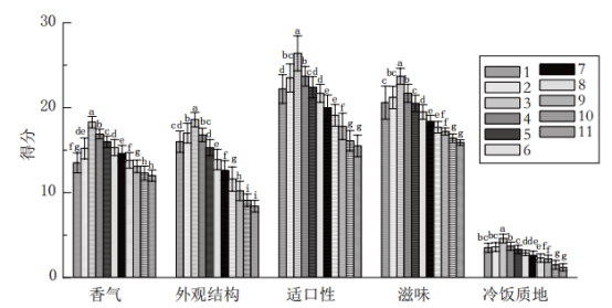 對11種樣品進行電子眼的主成分分析(PCA),由圖1可知,PC1的貢獻率為84.5%,PC2的貢獻率為9.8%,2個主成分的總貢獻率為94.3%,可以用來解釋樣品絕大部分信息。各樣品之間離散分布,均無交叉重疊,表明電子眼能夠鑒定出各樣本的顏色差異。隨著苦蕎米添加量的增大,苦蕎米飯的顏色變得越來越暗沉,黃褐色加深,光澤越來越差。在主成分分析圖中隨著苦蕎米添加量的增加,樣本逐漸從X軸的左軸向右軸移動,表明隨著苦蕎米比例增加顏色呈現規律變化。由于主成分1的貢獻率較大,因此可以根據樣本在X軸上的距離判斷樣本之間的差異。3與4號樣品顏色相似,9~11號樣品顏色相似,其余樣品顏色差異較大。