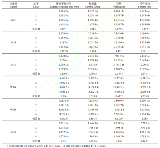 不同因素對電子鼻響應特性的影響不同因素對電子鼻各傳感器(W1C、W5S、W1S、W1W、W2W和W3S傳感器)的影響見表1。從表3可知,不同因素對電子鼻測定櫻花花香的影響差異顯著,對電子鼻傳感器的響應影響從大到小依次是不同花期、樣量、采樣時間,在不同頂空平衡時間因素下電子鼻各傳感器響應極差均最小。從各因素的不同水平看,在不同頂空平衡時間因素中,水平1、4高于水平2、3;樣品量中水平4的電子鼻各傳感器響應值顯著高于其他水平,水平1、2、3差異不顯著;在不同花期因素下,除了W1S傳感器之外,其余傳感器在水平3時的響應值高于其他水平,且與其他水平差異極顯著;采樣時間中各水平差異不顯著。說明電子鼻對盛開時期的櫻花花朵且樣品量為4g時響應較大。