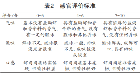 感官評(píng)價(jià)小組(8人)從鹽焗蝦的口感、滋味和氣味3個(gè)方面評(píng)定其品質(zhì),每項(xiàng)滿分為10分,感官評(píng)價(jià)總分為30分,評(píng)分標(biāo)準(zhǔn)見表1。