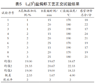 由表2極差值分析可知,各因素對(duì)感官評(píng)價(jià)的影響由強(qiáng)到弱依次為鹽焗溫度>花椒添加比例>鹽焗時(shí)間,即鹽焗溫度對(duì)感官評(píng)價(jià)分?jǐn)?shù)影響最大。最終確定的鹽焗蝦的優(yōu)化工藝為A2B2C2,即花椒添加比例2%、鹽焗時(shí)間20 min和鹽焗溫度180 ℃。按此最優(yōu)工藝進(jìn)行3次驗(yàn)證,所得鹽焗蝦的感官評(píng)分平均分為24.8分。