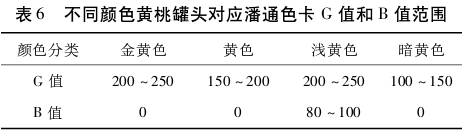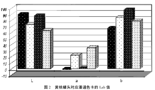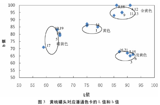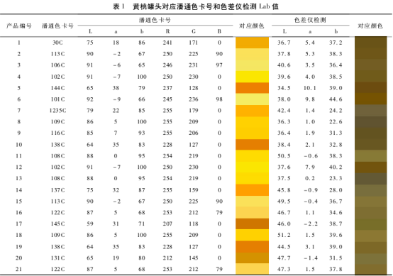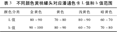 為了減少其他因素的干擾如品牌、價(jià)格、廣告、經(jīng)驗(yàn)等方面的影響,本實(shí)驗(yàn)決定采用雙盲法進(jìn)行檢驗(yàn)。所有的樣品都用3個(gè)隨機(jī)的數(shù)字進(jìn)行編碼,檢驗(yàn)樣品也隨機(jī)化。在進(jìn)行試驗(yàn)之前罐頭要先打開(kāi)5min,再將桃片放在白色瓷盤上。由訓(xùn)練型評(píng)價(jià)員以潘通色卡為參比物,尋找和黃桃罐頭相對(duì)應(yīng)的色卡,記錄下其Lab值和RGB值,然后再由訓(xùn)練型評(píng)價(jià)員根據(jù)經(jīng)驗(yàn),按照金黃色、黃色、淺黃色、暗黃色將其分為四類。