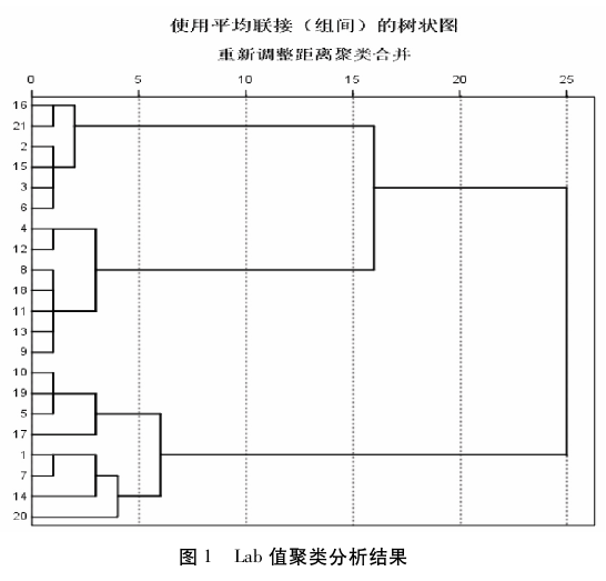 綜合Lab值和RGB值聚類分析,兩個(gè)顏色系統(tǒng)都可以對(duì)黃桃罐頭色澤進(jìn)行分類,但是RGB值更接近于人眼視覺(jué),能更好的對(duì)黃桃罐頭進(jìn)行分類。