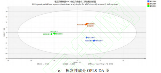 OPLS-DA是一種用于樣品判別分析的統計方法,有助于從大量代謝組學數據庫中篩選出差異性代謝物。OPLS-DA模型利用可變投影影響(VIP)評分來識別霉莧菜梗中的差異風味物質,VIP>1的物質是樣品中的差異代謝物。