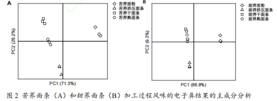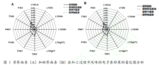 以上研究表明,擠壓加工及熱風(fēng)烘干可以促進(jìn)蕎麥面條風(fēng)味的形成,特別是熱風(fēng)干燥,其中全苦蕎面條風(fēng)味更加濃郁。
