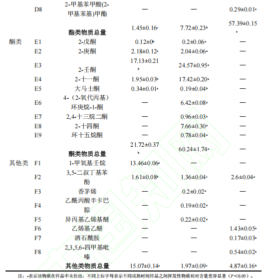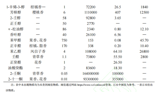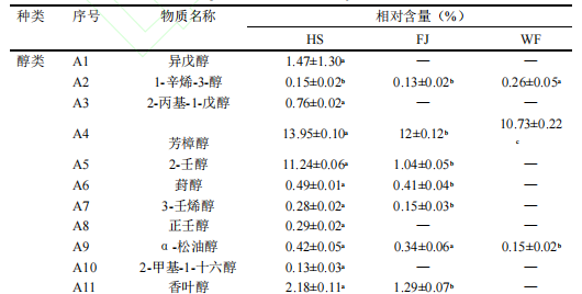 醇類在FJ、HS以及WF樣品中相對含量分別為26.36%、60.25%、13.32%。其中1-辛烯-3-醇、芳樟醇、α-松油醇為三組樣品共有物質,芳樟醇是三組樣品中相對含量最高的揮發性化合物,分別為FJ組(12%)、HS組(13.95%)、WF組(10.73%)。醛類物質在FJ、HS以及WF樣品中相對含量為2.16%、1.43%、21.09%。并且WF組中醇類物質相對顯著高于(P<0.05)其它兩組樣品。苯甲醛、正辛醛、苯乙醛、壬醛作為三組樣品共有物質。酸類物質樣品FJ(1.21%)、HS(0.63%)和WF(1.53%)中相對含量并不太高,且在WF中相對含量顯著高于(P<0.05)其他兩組。酯類物質主要在WF組樣品中檢出,相對含量為57.39%,顯著高于(P<0.05)FJ組(7.72%)與HS(1.45%)組。酮類物質在FJ和HS樣品中相對含量分別為60.24%和21.72%,而WF樣品中則并未檢測到此類物質。其中2-壬酮為FJ于HS樣品中共有且相對含量最高的物質,可以為發酵后的濃汁貢獻花香與果香。其他揮發性物質在三組樣品中共檢出8種,其中3,5-二叔丁基苯酚為HS、FJ、WF樣品共有揮發性化合物。