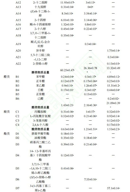 由表1可知3組樣品中共檢測出揮發性化合物57種,其中醇類22種、醛類6種、酸類4種、酯類8種、酮類9種、其他類8種。