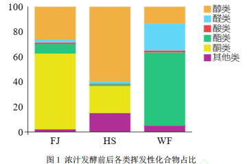將FJ(發酵)、HS(后熟)、WF(未發酵)的濃汁樣品進行GC-MS檢測,揮發性化合物種類以及各類物質在樣品中的占比見圖1。由圖1可知WF樣品中共檢測出5類揮發性化合物,分別為:醇(13.56%)、醛(21.48%)、酸(1.56%)、酯(58.44%)、其他(4.96%),其中主要揮發性物質為酯類;FJ樣品中共檢測出6類揮發性化合物,分別為醇(26.45%)、醛(2.17%)、酸(1.21%)、酯(7.75%)、酮(60.45%)、其他(1.98%),其中酮類為主要揮發性物質;HS樣品中共檢測出6類揮發性化合物,分別為醇(59.92%)、醛(1.42%)、酸(0.63%)、酯(1.44%)、酮(21.60%)、其他(14.99%),其中醇類為主要揮發性物質。