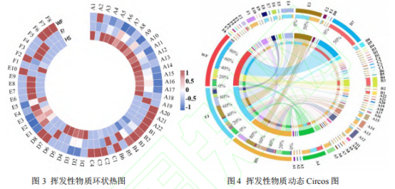 聚類熱圖與動態Circos圖都可以結合大量數據,以漸進色帶和對應顏色標簽的占比形式共同將檢測得到的各揮發性化合物與三組樣品的相關性直觀的展現出來。結合圖3、圖4分析可知,在HS樣品中醇類(A)物質相對含量及種類較多,其中包括芳樟醇(A4)、2-壬醇(A5)和2-十二烷醇(A12)等物質。FJ樣品中酮類(E)物質相對含量與種類相較另外兩組樣品較多,主要包括:2-壬酮(E3)、2-十一酮(E4)等物質。WF樣品中醛類(B)與酸類(C)物質占據主導,其中芳樟醇(A4)、苯乙醛(B3)等物質為濃汁本身提供了堅果香氣與櫻桃香氣,并且酸類在其發酵過程中為其他風味物質的形成提供了前體物質。這一結果與表1及PCA分析一致。