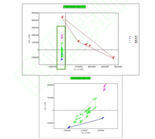 在分析不同種沒藥氣味差異標(biāo)志物時,比對放大色譜圖以尋找樣品組間的差異往往繁瑣且復(fù)雜,這種方法雖然直觀,但效率低下、易出錯。為了簡化這一過程并提高分析的準(zhǔn)確性,本研究采用了一種“先統(tǒng)計后化學(xué)”的方法。首先,運(yùn)用PCA對樣品組間的氣味數(shù)據(jù)進(jìn)行深入挖掘。PCA能夠迅速定位到樣品間氣味的主要差異所在,通過降維處理,將復(fù)雜的數(shù)據(jù)集簡化為幾個主要的成分,從而更容易識別出差異性色譜峰,在對色譜峰進(jìn)行了篩選時,要選取那些區(qū)分度顯著、峰面積較大且分離效果良好的色譜峰。經(jīng)過篩選,樣品整體的氣味分布趨勢與未經(jīng)篩選前保持一致,可以充分證明所選的色譜峰能夠準(zhǔn)確地代表樣品整體的氣味特征。接著,借助AroChembase數(shù)據(jù)庫,對具有顯著差異的色譜峰進(jìn)行了詳細(xì)的定性分析,識別這些色譜峰中可能包含的化合物。