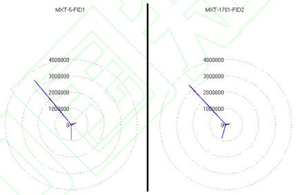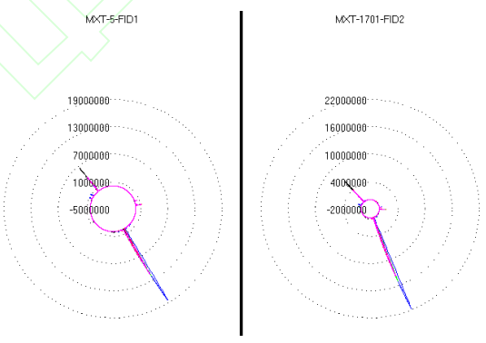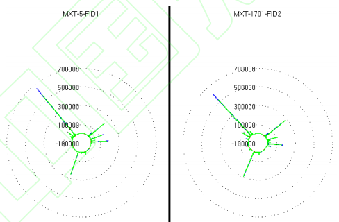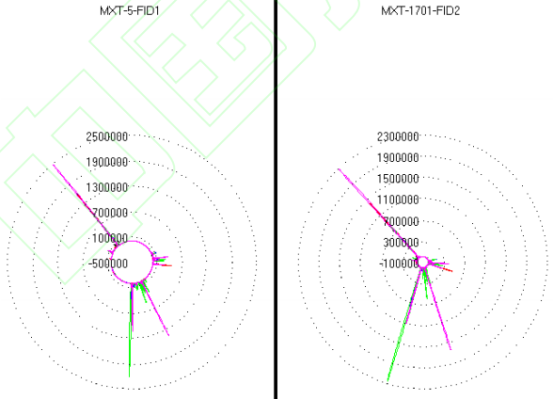將GC數(shù)據(jù)進(jìn)行同組疊加處理可以更清晰地觀察組內(nèi)共有特征和細(xì)微差異,有助于識別同組樣本中普遍存在的化合物及其相對含量。圖2~圖9為各組(組1~組4)沒藥樣品原始GC疊加圖和雷達(dá)圖疊加圖,GC疊加圖分別展示MXT-5非極性毛細(xì)管柱與MXT-1701中極性毛細(xì)管柱結(jié)果,雷達(dá)圖也可以看出組間和組內(nèi)沒藥峰面積和保留時間的差異。組1(JZ1∼JZ4、JZ6)、組2、組3、組4(K1、M5、J1、W1、JZ5)在各自的GC疊加圖和雷達(dá)圖疊加圖中均呈現(xiàn)出相似特征:出峰時間差異不大、峰面積差異較大。