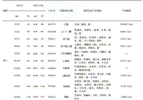 AroChembase數(shù)據(jù)庫是一個針對Kovats RI的定性數(shù)據(jù)庫,通過比對數(shù)據(jù)庫中的信息,能夠準(zhǔn)確識別出那些導(dǎo)致樣品組間氣味差異的揮發(fā)性物質(zhì)。這種方法不僅提高了分析效率,而且增強(qiáng)了結(jié)果的準(zhǔn)確性和可靠性。